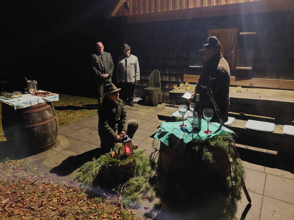 Zu guter Letzt nutze Hornmeister Rudi Jandrasits die feierliche Gelegenheit im stimmungsvollen Rahmen der Jagdhütte, Barbara Sitter zur Gamsjägerin zu schlagen. Anschließend wurde in der Hütte lukullischen Höchstgenüssen gefrönt – mit Wildschweinbraten und dem einen oder anderen feinen Tropfen.